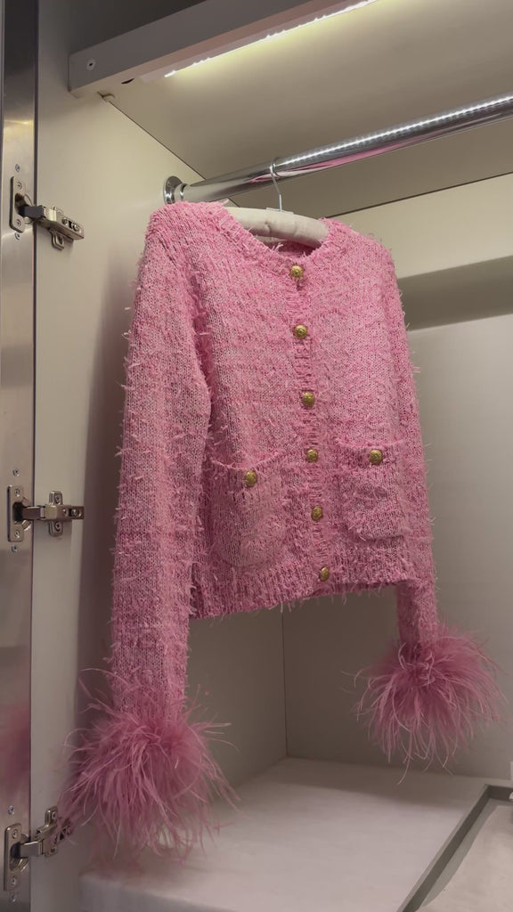 Soft textured cardigan sweater with metallic detailing and front buttons. It features decorative pockets and a comfortable stretch. The boa feathers on the cuffs are removable (please remove them before washing). Shell: 49% polyester, 30% acrylic, 21% nylon.